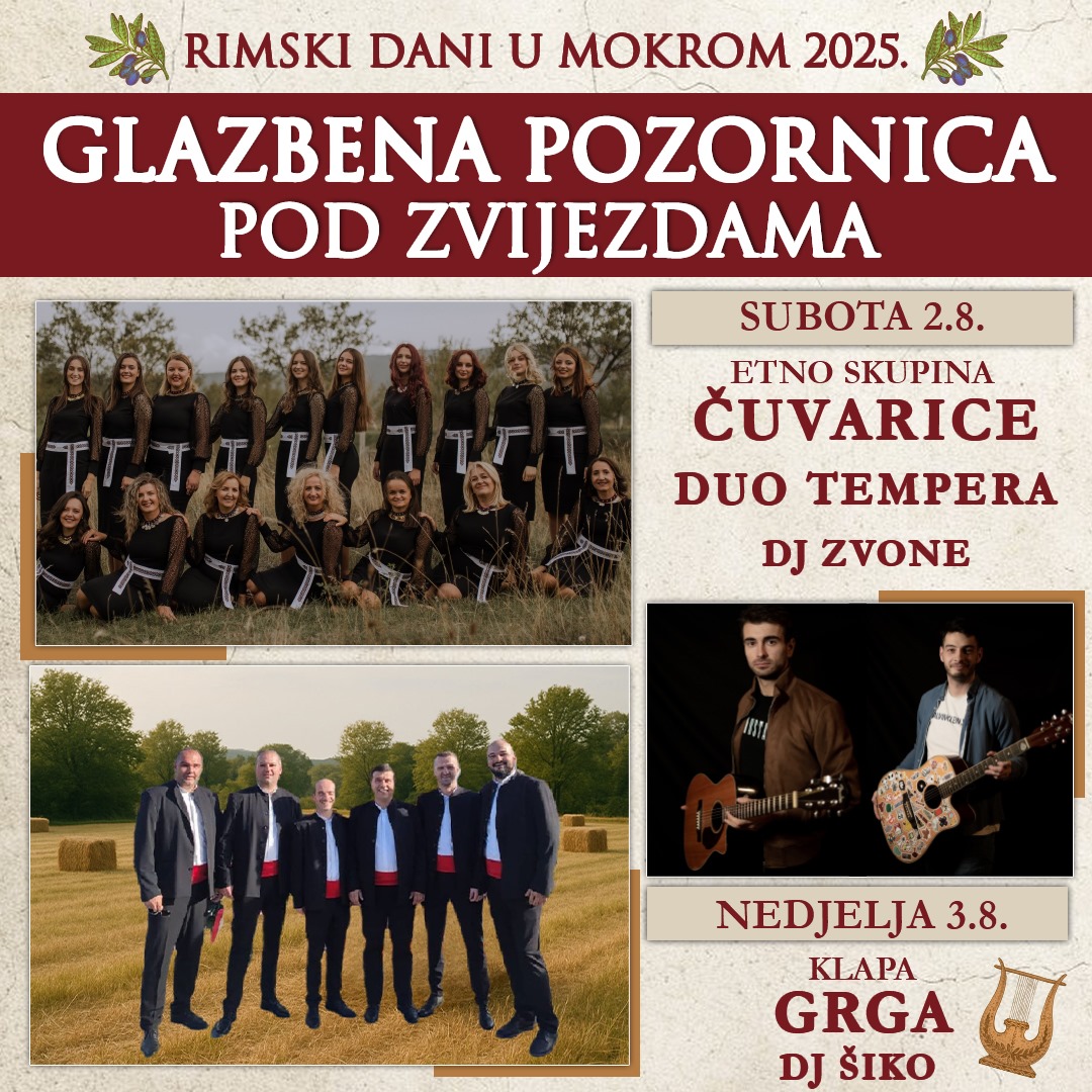 Kad se noć spusti nad antičko Mokro, sve miruje – osim pozornice! Očekuju nas dvije večeri ispunjene glazbom, emocijama i plesom pod zvjezdanim nebom!