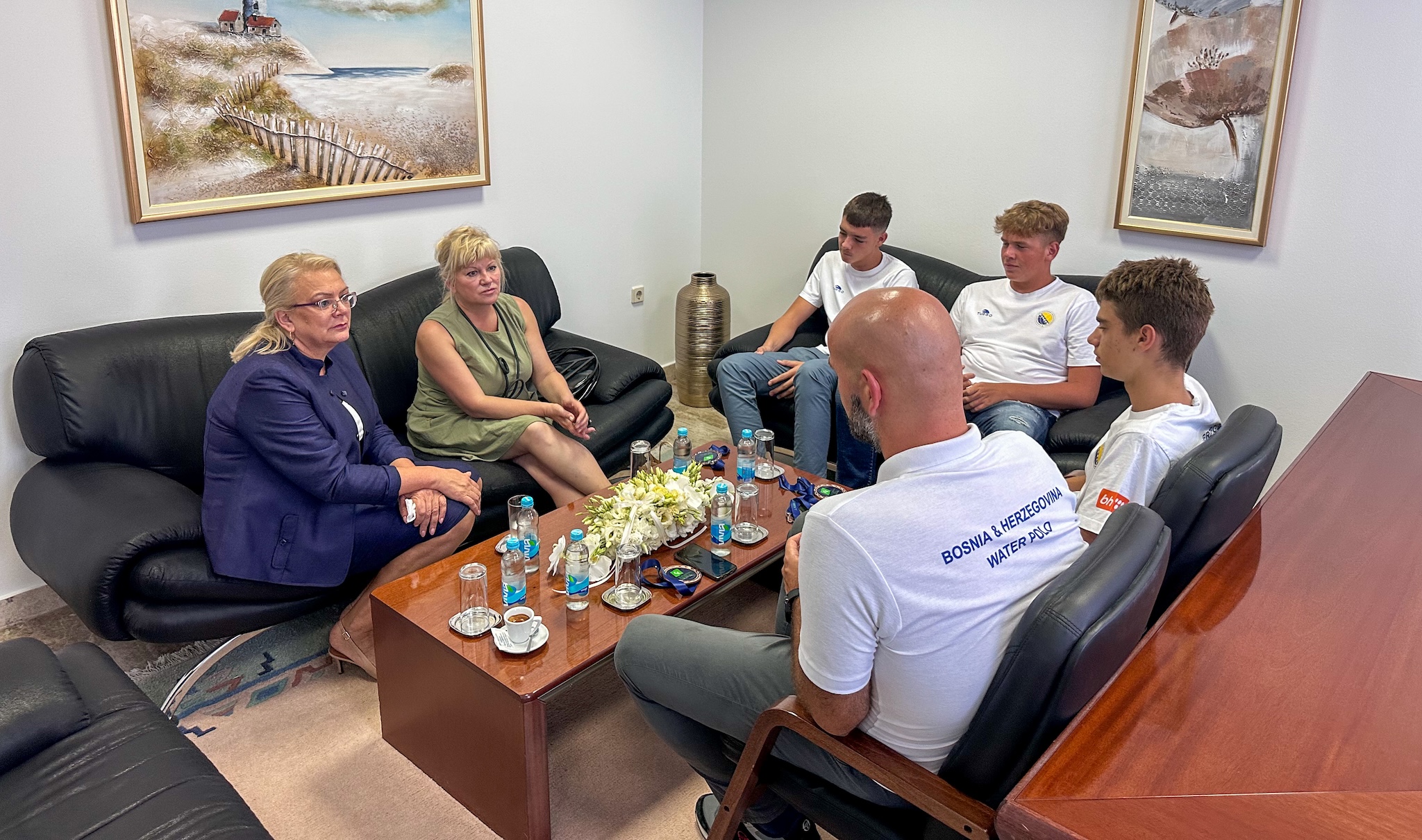 Predsjednica Federacije Bosne i Hercegovine Lidija Bradara i federalna ministrica kulture i sporta Sanja Vlaisavljević primile su u Mostaru izbornika vaterpolo reprezentacije BiH do 16 godina Kristijana Njavru i trojicu mladih bh. reprezentativaca iz Neuma – Dominika Grbešića, Ivu Jurkovića i Josipa Bačića – povodom nedavnog povijesnog uspjeha na Europskom U16 prvenstvu u Ljubljani, gdje je BiH osvojila brončanu medalju.