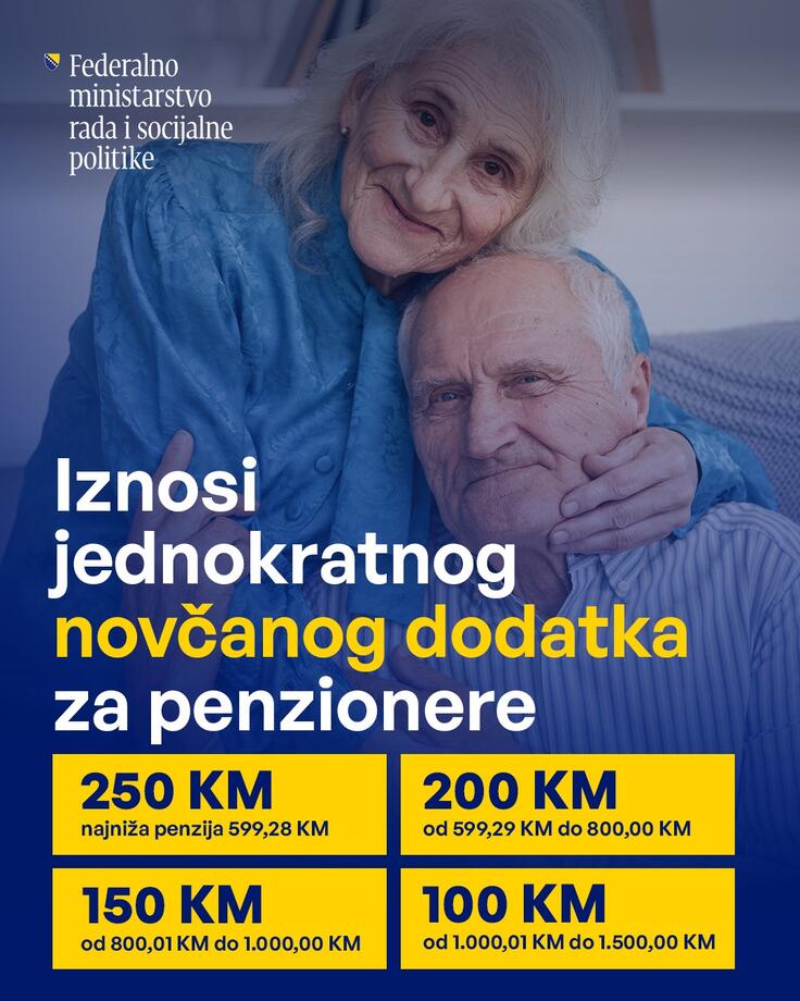 Vlada Federacije Bosne i Hercegovine na hitnoj sjednici, na prijedlog Federalnog ministarstva rada i socijalne politike, donijela je Uredbu o isplati jednokratnog novčanog dodatka korisnicima mirovina Federalnog zavoda za mirovinsko i invalidsko osiguranje koji imaju prebivalište na teritoriju Bosne i Hercegovine.
