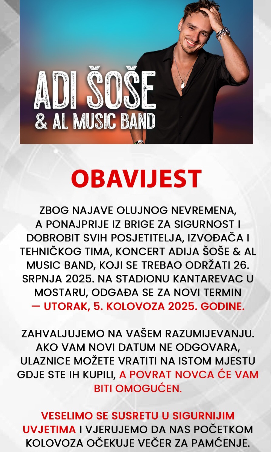 Zbog oluje i lošeg vremena koje je najavljeno za sutra navečer, koncert Adija Šoše se pomjera na novi termin, u utorak 5.8.