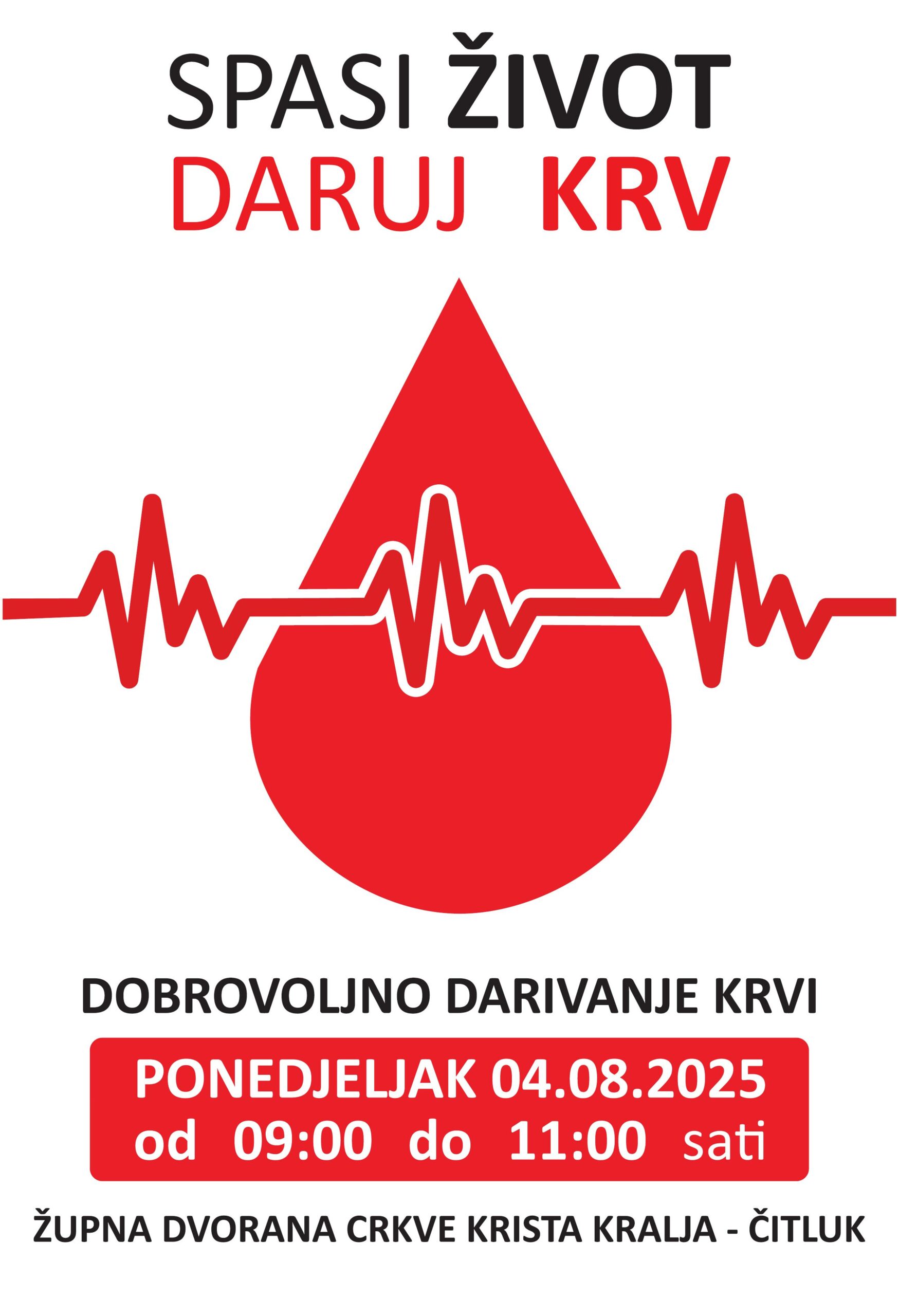 Franjevački svjetovni red Čitluk u suradnji sa odjelom za transfuziologiju KBC-a Mostar i Crvenim križem Čitluk organiziraju dobrovoljno darivanje krvi koje će se održati u ponedjeljak 04.08.2025 u vremenu od 09 do 11 sati u dvorani pored župnog ureda crkve Krista Kralja u Čitluku.