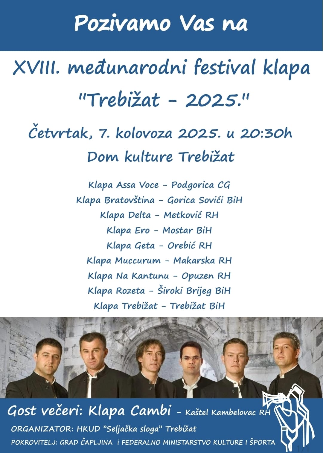 Pozivamo vas na jedinstveni glazbeni doživljaj, XVIII. međunarodni festival klapa “Trebižat – 2025.”, koji će se održati u četvrtak, 7. kolovoza 2025. godine, u 20:30 sati, u Domu kulture u Trebižatu.
