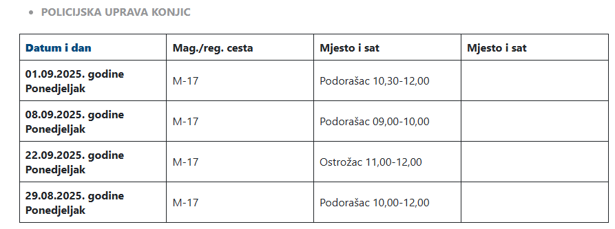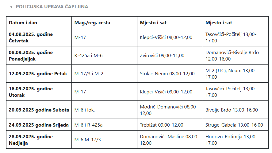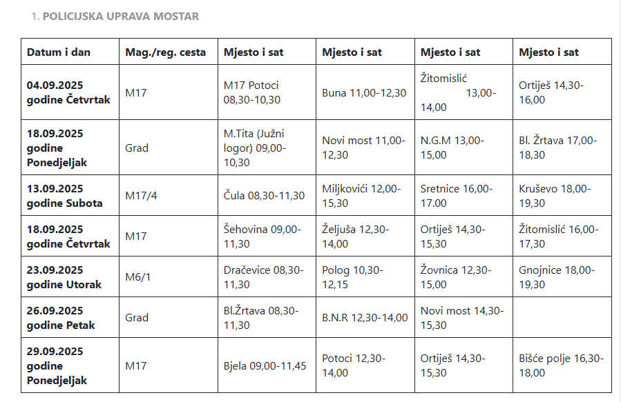 Plan radarskih kontrola za mjesec rujan 2025. godine, na cestama HNŽ-a:
