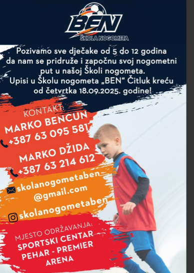 Pozivamo sve dječake od 5 do 12 godina da se pridruže i započnu svoj nogometni put u Školi nogometa „BEN“.
