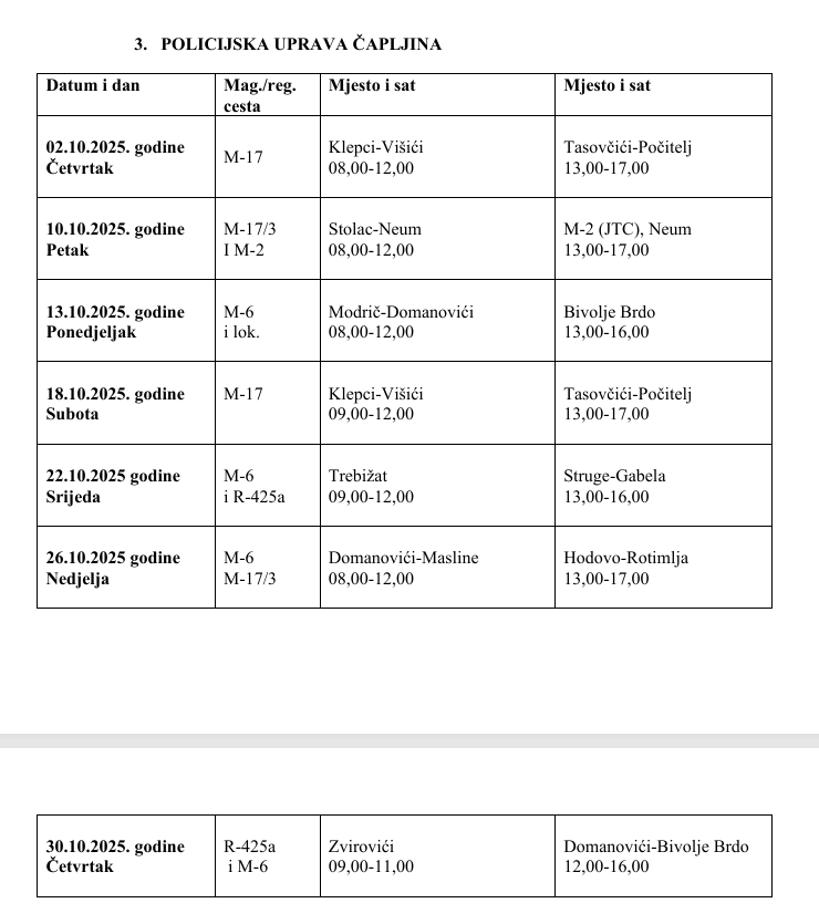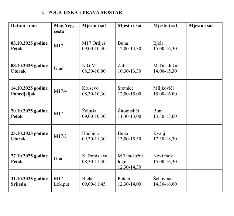 Plan radarskih kontrola Uprave policije MUP-a HNŽ/K za mjesec listopad 2025. godine: