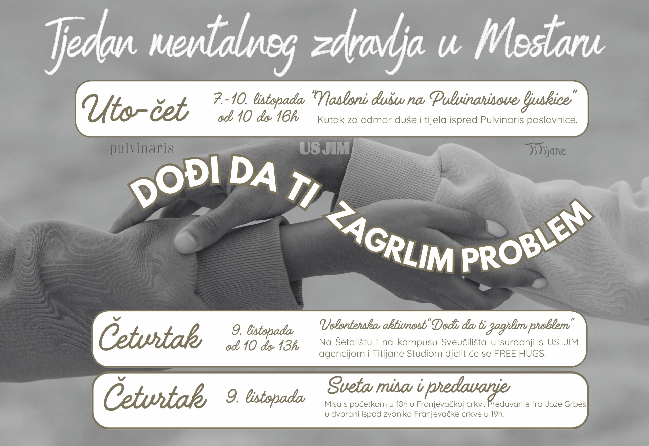 U četvrtak, 9. listopada, od 10 do 13 sati na šetnici u Mostaru, volonteri će dijeliti FREE HUGS – zagrljaje podrške svima kojima su toga dana potrebni. Poruka ovog simboličnog čina glasi: „Problem treba zagrliti i pronaći rješenje, a ne od njega bježati i štetiti vlastitom zdravlju.“