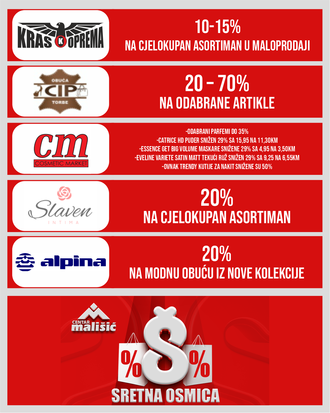 Ove SRIJEDE,08.listopada ne propustite prigodu posjetiti prodajni centar Mališić Međugorje jer pred nama je još jedna Sretna Osmica, dan odličnih akcijskih popusta i pogodnosti.