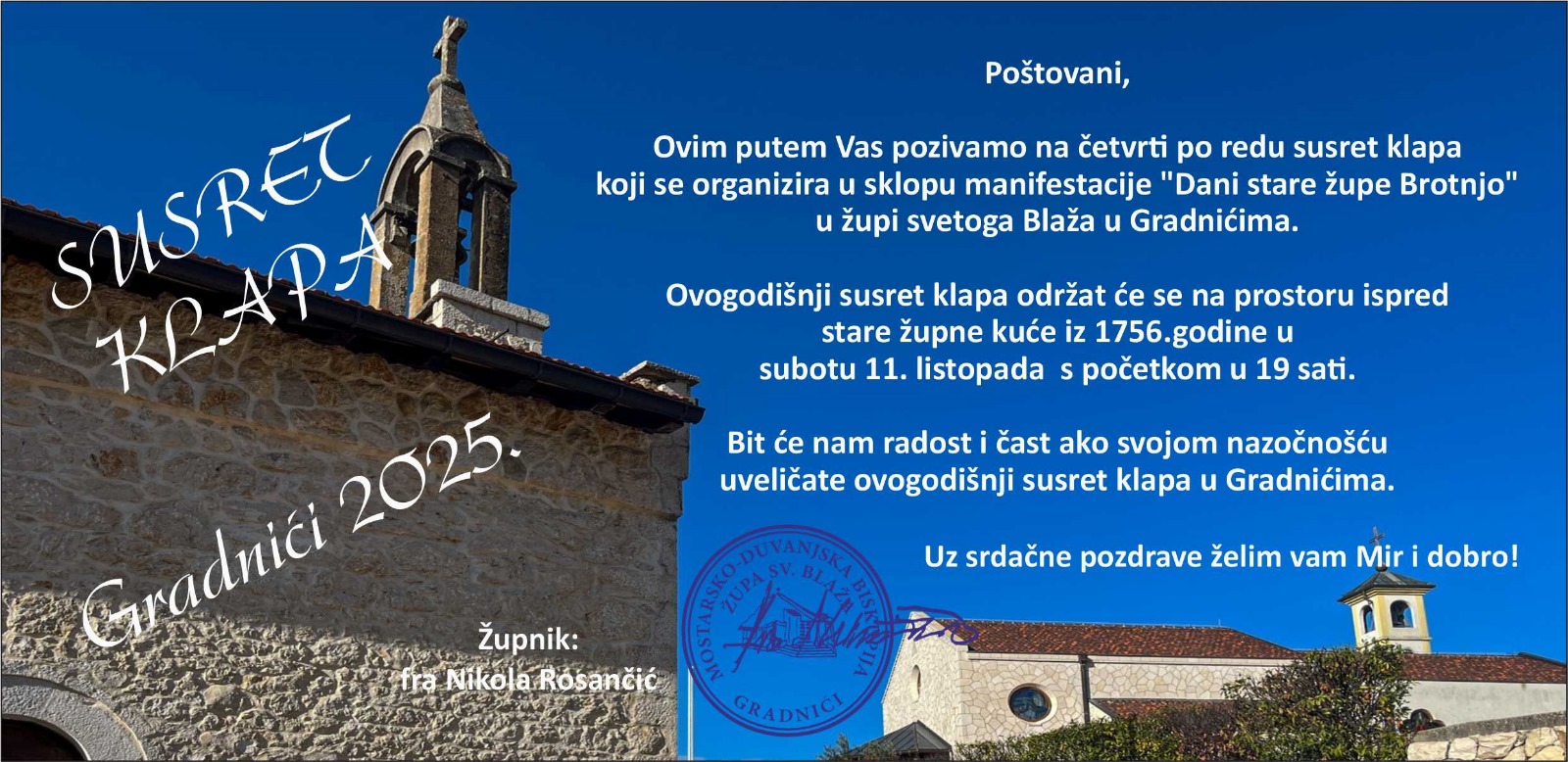 U župi svetoga Blaža u Gradnićima u subotu, 11. listopada, s početkom u 19 sati, održat će se četvrti po redu “Susret klapa” u sklopu manifestacije “Dani stare župe Brotnjo”.