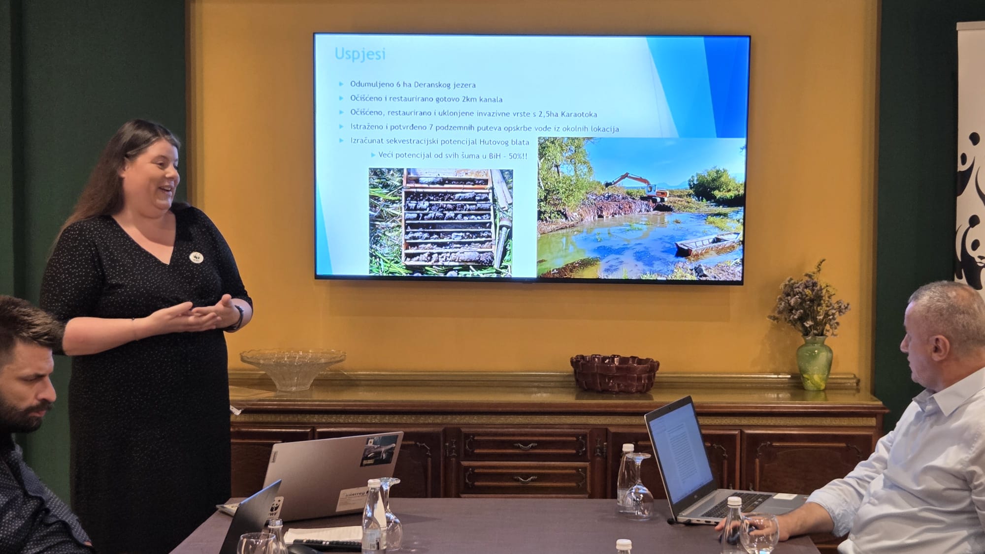 „Prema zadnjim istraživanjima koja smo ovdje proveli, dokazano je da Hutovo blato ima kapacitet skladištenja ugljika veći nego sve šume BiH, koje pokrivaju preko 50% površine te zemlje. U četiri godine zajedničkog rada u Hutovom blatu, restaurirano je preko 1488 ha površine parka. Gotovo dva kilometra kanala koji dovode vodu do svakog kutka blata smo restaurirali i obnovili njihove kapacitete zadržavanja vode. Odmuljivanjem šest hektara Deranskog jezera osigurane su ogromne količine vode koje su krucijalne za održavanje bioraznolikosti ali i sigurnosti lokalnog stanovništa. Protočnost kanala i veća zapremnina vode izravno doprinose borbi protiv klimatskih promjena održavajući tresetni obruč u kojem se skladišti CO2 iz atmosfere. Istraživanjima je potvrđeno čak sedam različitih podzemnih puteva kojima se blato puni vodom iz različitih okolnih izvora, poput krških polja u kojima nalazimo endemske vrste riba, koje je pod hitno potrebno zaštiti. Područje Karaotoka od dva i pol hektara smo očistili od invazivnih vrsta i restaurirali kako bi posjetitelji mogli uživati u netaknutoj prirodi”, objasnila je Jarak.