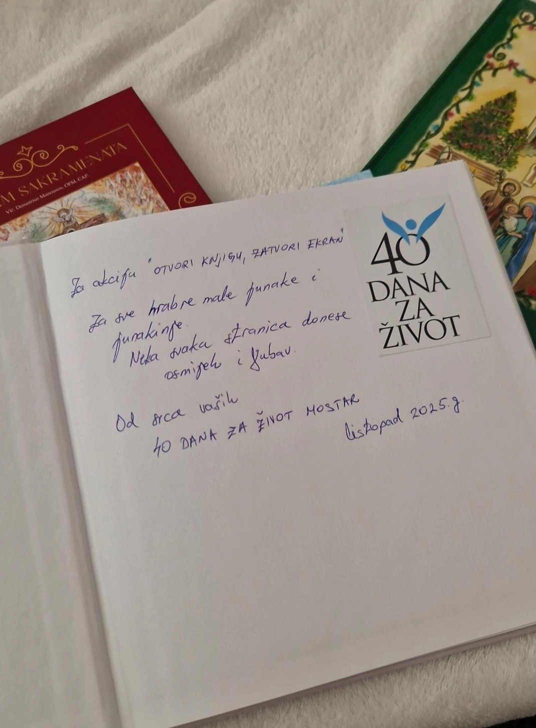 U tijeku je kampanja „40 dana za život”, koja se tradicionalno održava i u Sveučilišnoj kliničkoj bolnici Mostar. Danas su inicijatori kampanje Ivana i Davor Ramljak te Danijela Mustapić, nakon svete mise u bolničkoj kapelici, primili pokretačicu akcije za knjižnicu na odjelima Pedijatrije i Dječje kirurgije Antonelu Vučić, te predsjednicu Zajednice žena ŽO HDZ-a Kraljica Katarina Kosača HNŽ-a, Anu Groznicu.