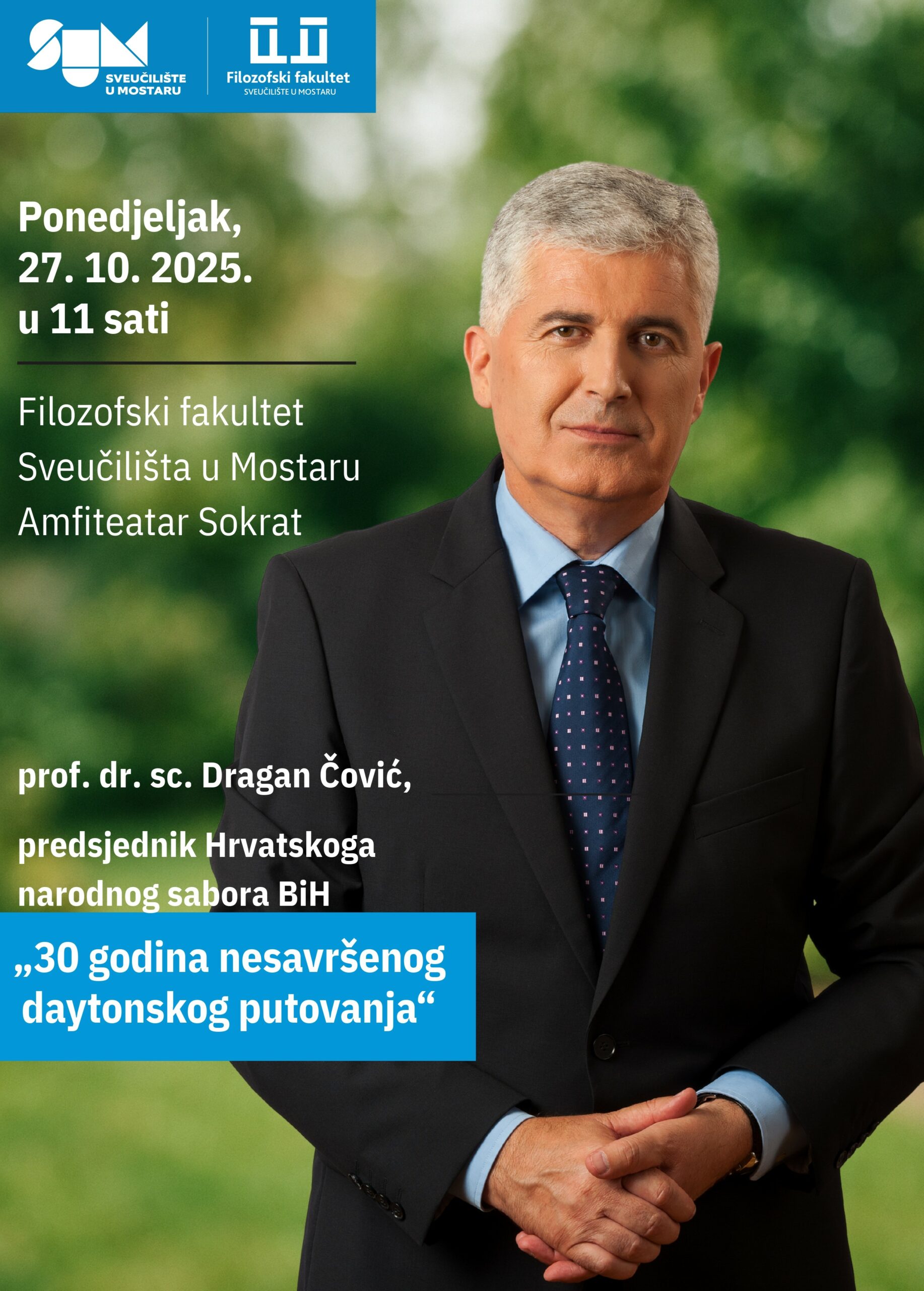 Na Filozofskom fakultetu Sveučilišta u Mostaru u ponedjeljak 27. listopada u 11.00 sati (amfiteatar Sokrat) bit će održano predavanje predsjednika Hrvatskoga narodnog sabora BiH prof. dr. sc. Dragana Čovića na temu „30 godina nesavršenog daytonskog putovanja“.