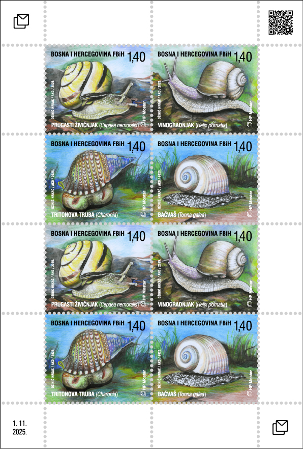 Magdalena Džinić Hrkać autorica je izdanja „Fauna 2025.“ koje sadrži četiri marke s motivima morskih i kopnenih puževa. Tritonova truba i puž bačvaš najveći su puževi u Jadranskom moru i spadaju u rijetke i zaštićene vrste. Ime tritonove trube veže se uz grčkog boga Tritona, sina boga mora Posejdona, koji je pušući u školjku kao u trubu uzdizao i smirivao valove. Puž bačvaš ima jednu rijetku karakteristiku – mogućnost luminescencije jer, kada se kreće vodom s potpuno raširenim stopalom, svijetli zelenkastom bojom. Vinogradnjak je jedan od najvećih kopnenih puževa., a prugasti živičnjak jedan je od najčešćih kopnenih puževa u Europi.