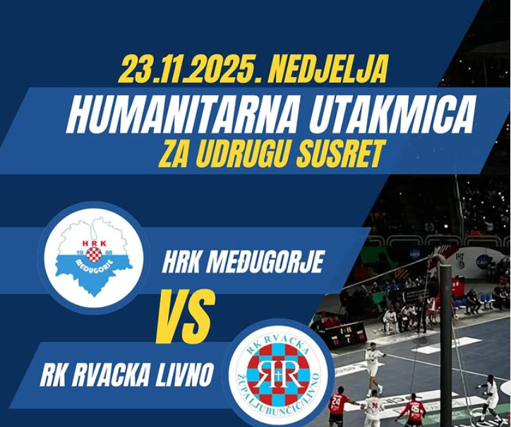 Naši rukometaši HRK MEĐUGORJE i gosti iz RK RVACKA LIVNO odigrat će veliku humanitarnu utakmicu čiji je sav prihod namijenjen Udruzi “Susret” – udruzi koja svakodnevno daje svoje srce za djecu s poteškoćama u razvoju i osobe sa invaliditetom.