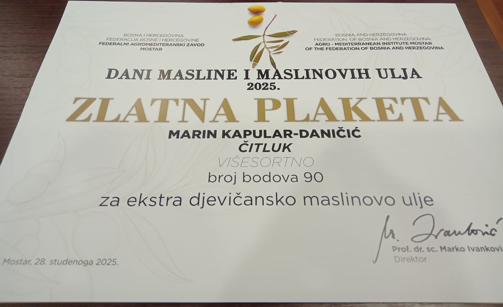 U Federalnom agromediteranskom zavodu u Mostaru održan je završni skup 15. Dana masline i maslinovih ulja, koji je uključivao promotivno-ocjenjivačku i znanstveno-stručnu radionicu. Kvaliteta pristiglih uzoraka maslinovih ulja ocijenjena je prema važećim pravilnicima BiH, uz laboratorijsku kontrolu i senzorno ispitivanje koje su proveli iskusni ocjenjivači iz Panela za organoleptičku ocjenu maslinovih ulja, prenosi bljesak.info