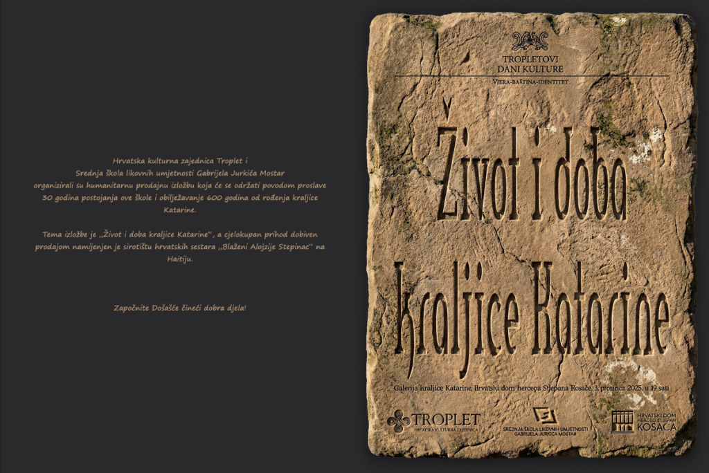 U okviru Tropletovih dana kulture – vjera, baština, identitet, u povodu proslave 30. obljetnice utemeljenja Srednje škole likovnih umjetnosti Gabrijela Jurkića Mostar i 600. obljetnice rođenja kraljice Katarine, u srijedu, 3. prosinca bit će upriličena humanitarnu prodajnu izložbu likovnih radova profesora i učenika jubilarne škole.