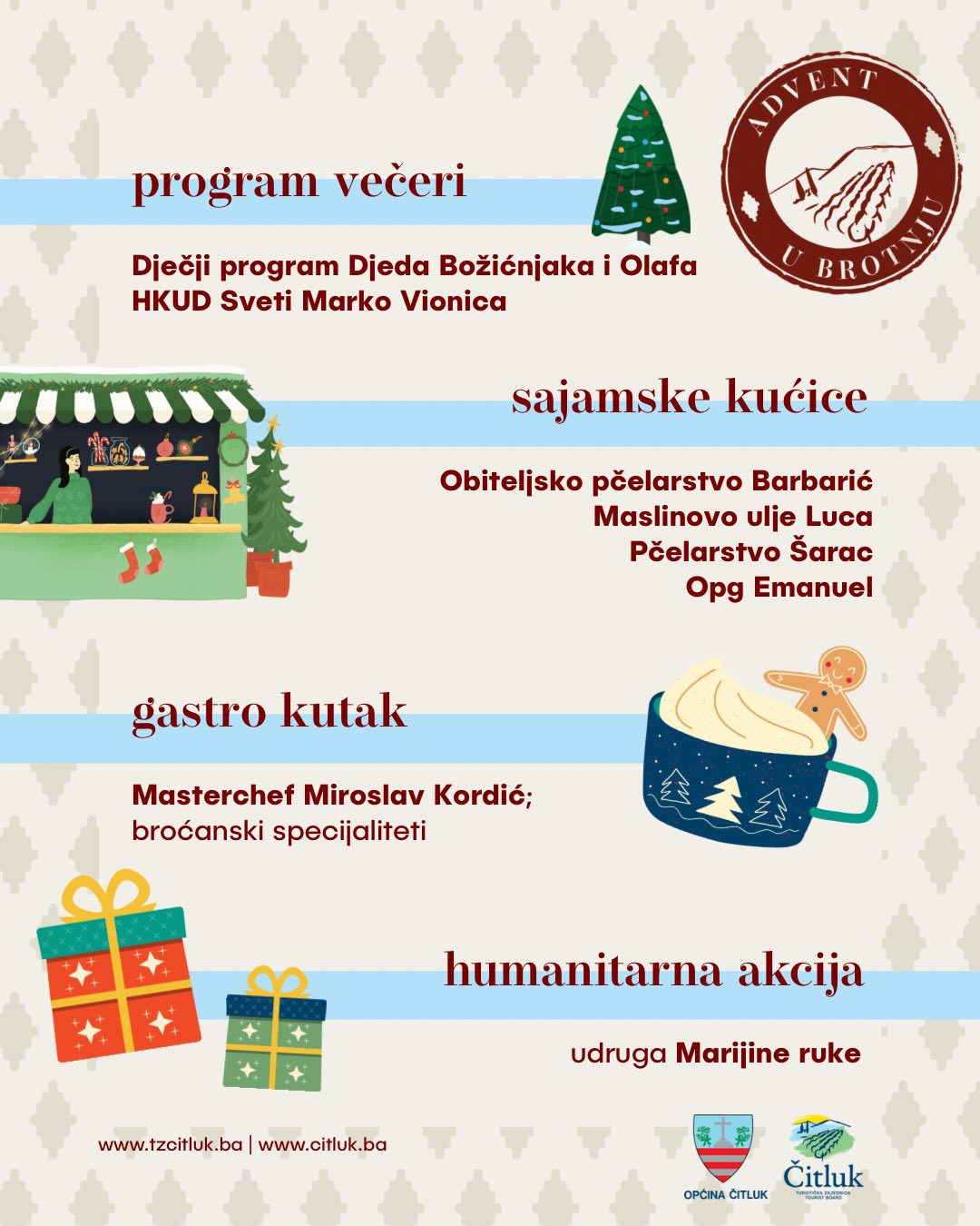 “Pozivamo sve da nam se pridruže i zajedno uživaju u blagdanskoj atmosferi, druženju i toplini Adventa u Brotnju!” – poručili su iz Turističke zajednice Općine Čitluk.