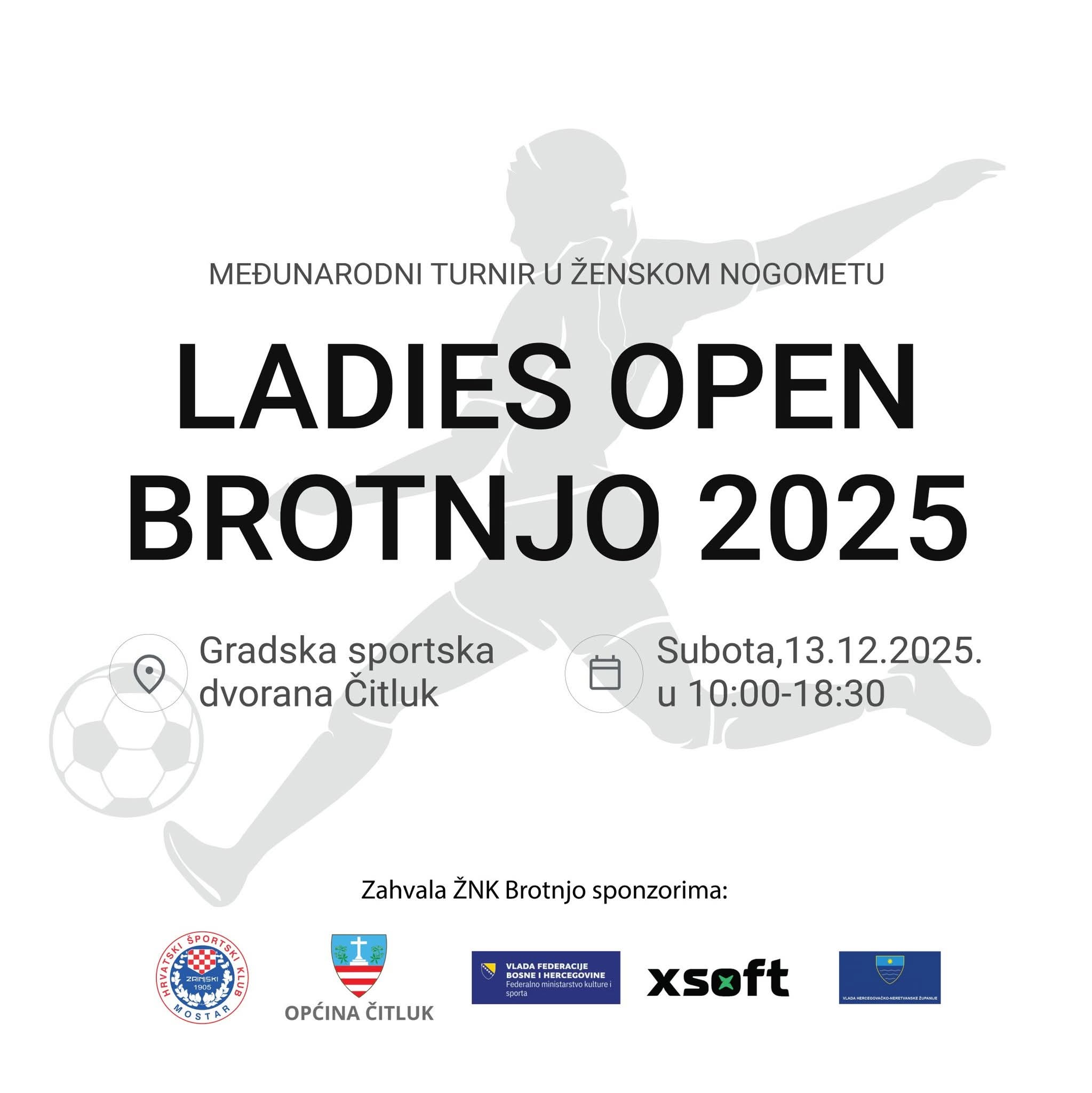 U Čitluku će se ove subote održati osmo izdanje međunarodnog turnira u ženskom nogometu LADIES OPEN BROTNJO 2025, tradicionalne sportske manifestacije koja iz godine u godinu okuplja sve veći broj ekipa. Turnir se, kao i prethodnih godina, igra u  Gradskoj športskoj dvorani Čitluk.