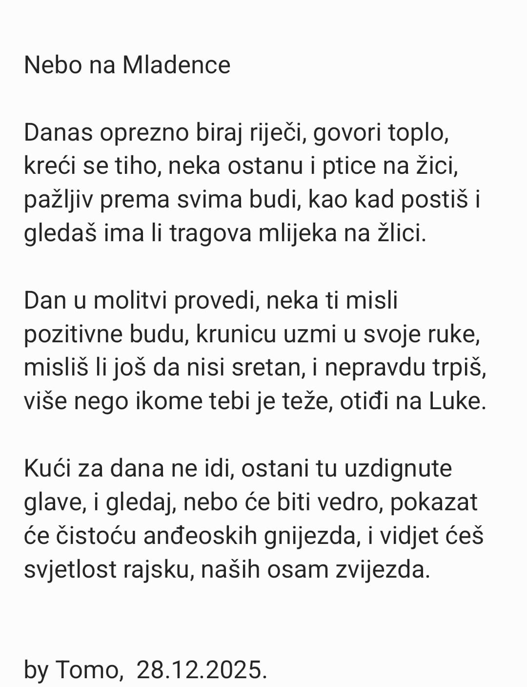 Pjesnik iz Posušja Tomo Raič, na Blagdan nevine dječice – Mladence, bio je na Tribistovu, otišao na Luke, na mjestu stradanja posuških anđela i na tužno sjećanje na njih napisao pjesmu, piše TomislavNews.