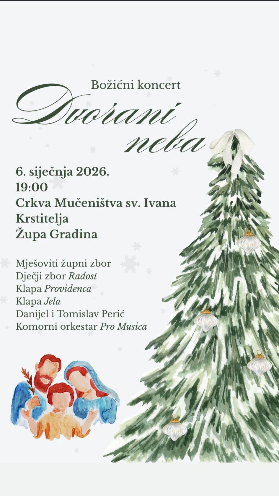 Božićni koncert “Dvorani neba”, održat će se 6. siječnja 2026. godine, s početkom u 19:00 sati, u Crkvi Mučeništva sv. Ivana Krstitelja u Župi Gradina.