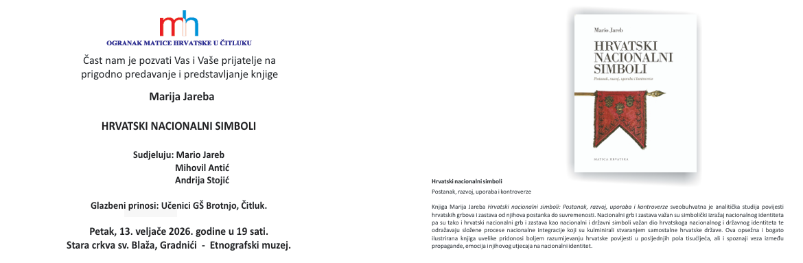 Predstavljanje knjige „Hrvatski nacionalni simboli” uglednoga hrvatskog povjesničara i potpredsjednika Matice hrvatske, dr. sc. Marija Jareba, biti će održana u obliku predavanja, u petak, 13. veljače 2026. godine, u 19 sati u Gradnićima.