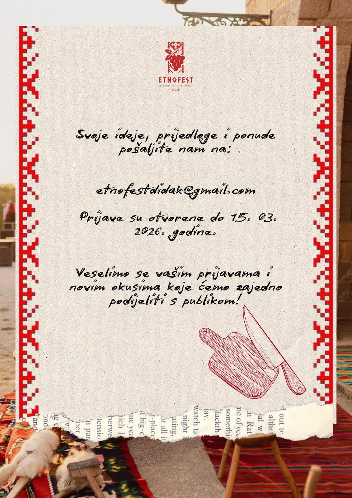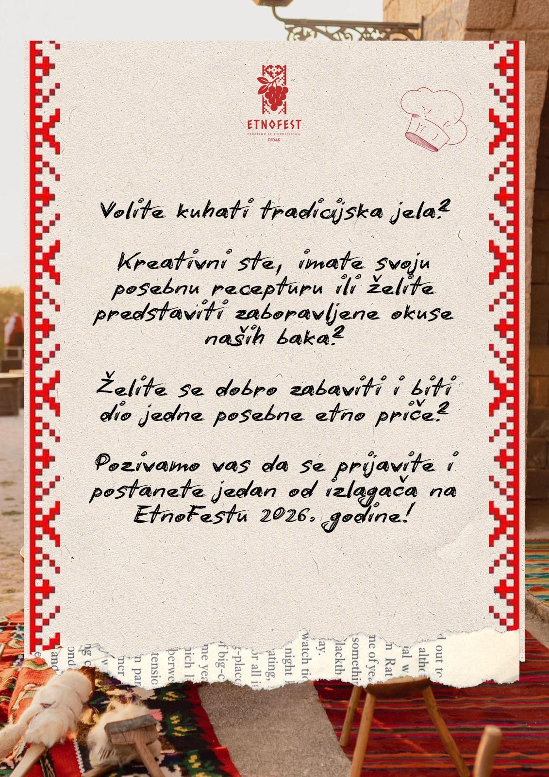 Pozivamo vas da se prijavite i postanete jedan od izlagača na EtnoFestu 2026. godine!
