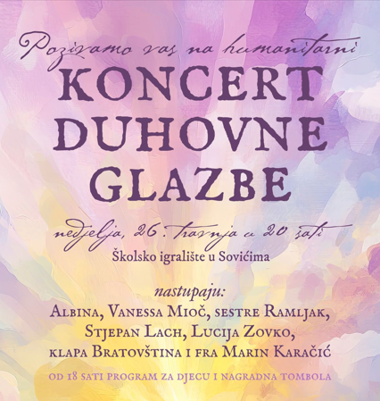 Pozivamo vas na humanitarni koncert duhovne glazbe koji će se održati u nedjelju, 26. travnja na školskom igralištu u Sovićima s početkom u 20 sati.