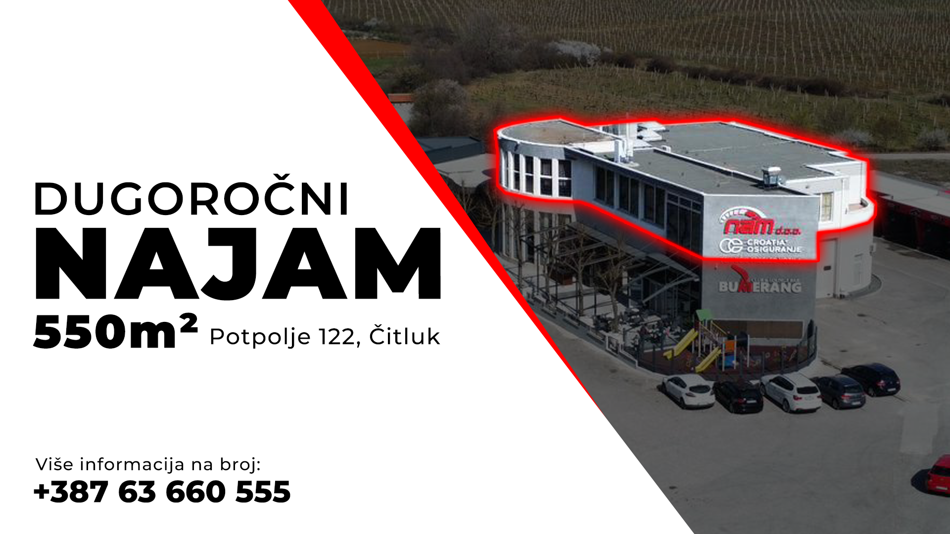 Izdaje se reprezentativan poslovni prostor ukupne površine 550 m², smješten na prvom katu poslovnog objekta na izvrsnoj i frekventnoj lokaciji Potpolje 122 (NAM d.o.o. – Bumerang).